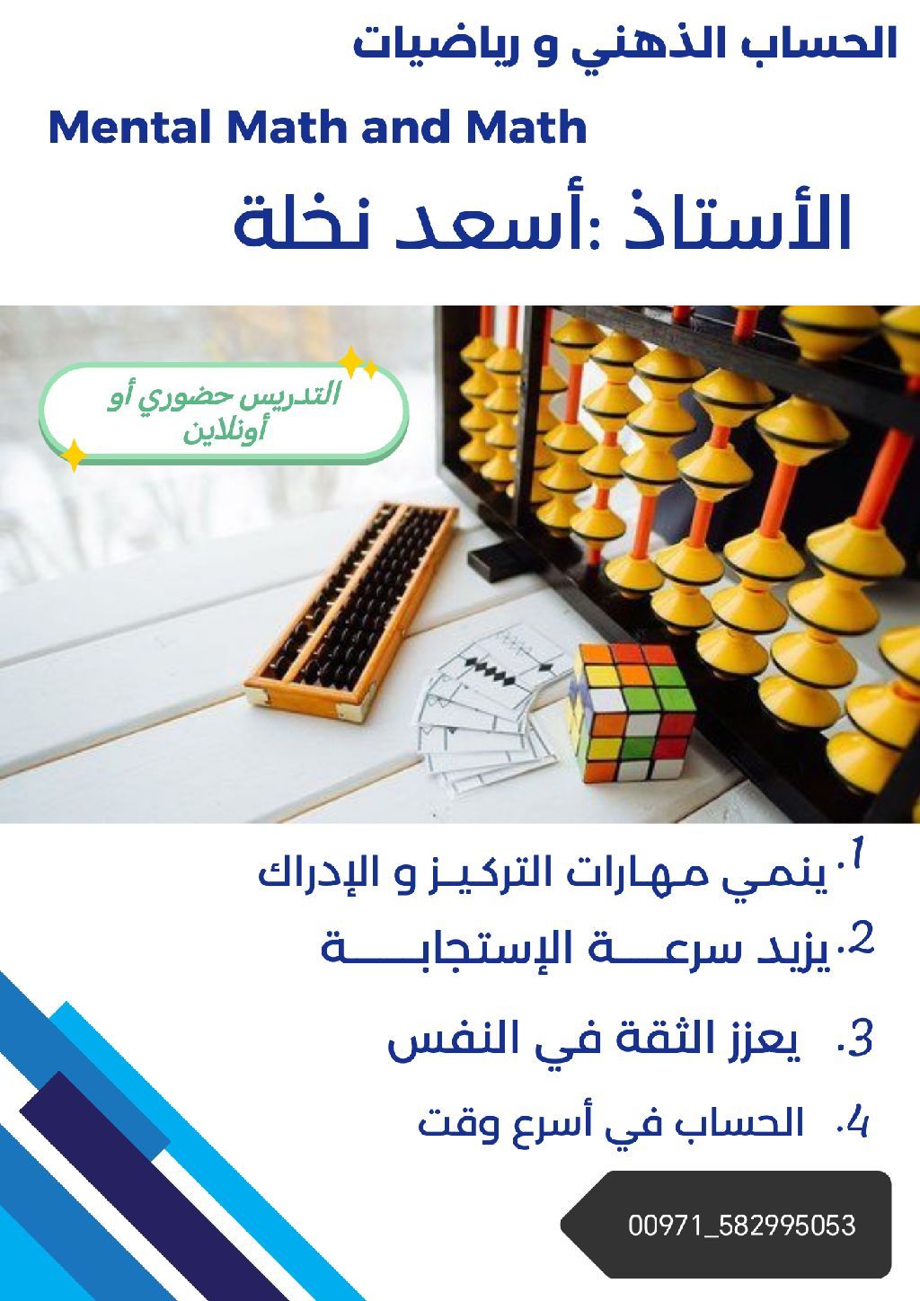 هل تريد لطفلك أن يتفوق في الرياضيات ويحب الأرقام دروس حساب ذهني abacous ورياضيات من الصف الأول حتى الصف السابع (G1 - G7) وتأسيس قوي في الرياضيات للاطفال بأسلوب ممتع وسهل الفهم ومتابعة مدرسية نطور مهارات التركيز، وسرعة الحساب، والتفكير المنطقي تمارين تفاعلية - ألعاب تعليمية - متابعة فردية لكل طالب الدروس متاحة حضوريا أو اونلاين