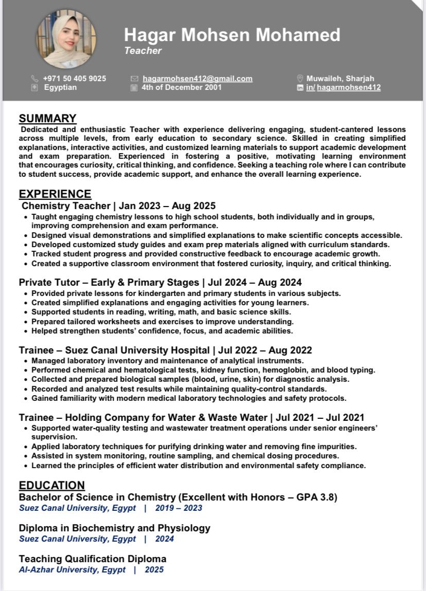 Science teacher with B Sc. in Chemistry (Excellent) and Educational Diploma. Experienced in interactive lessons, worksheets, quizzes, and group or one - to - one teaching. Seeking Teacher/ Tutor position in Sharjah. Contact