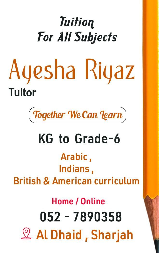 Tuition for all subjects, let's together we can learn. KG TO GRADE 6. Arabic, Indian, BRITISH & American CURRICULUM. Al Dhaid, Sharjah. call