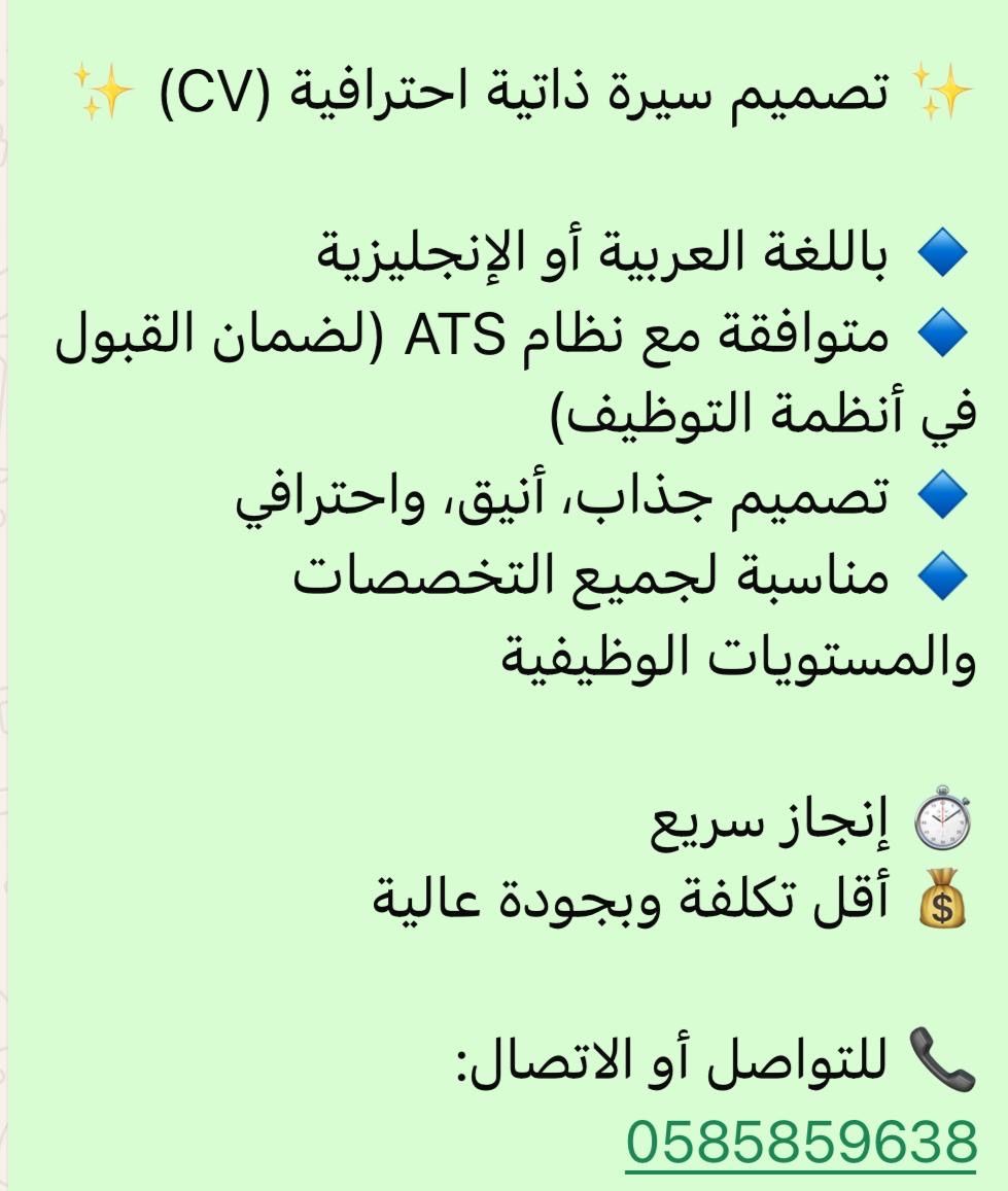 تصميم سيرة ذاتية احترافية (CV) باللغة العربية أو الانجليزية متوافقة مع نظام ATS (لضمان القبول في أنظمة التوظيف) تصميم جذاب، أنيق، واحترافي مناسبة لجميع التخصصات والمستويات الوظيفية انجاز سريع أقل تكلفة وبجودة عالية
