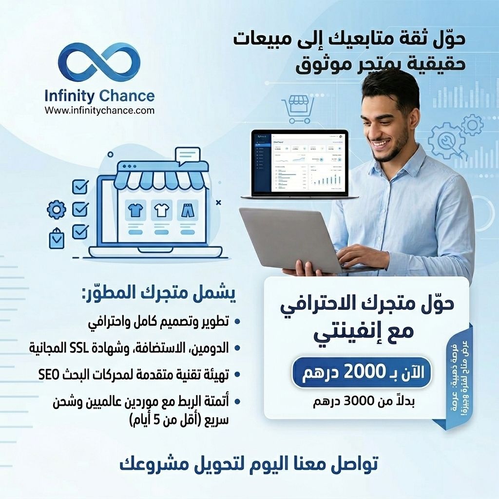 ابدأ مشروع أحلامك اليوم ووفر 1000 درهم لماذا تبدأ من الصفر بينما يمكنك الحصول على متجر الكتروني جاهز، احترافي، ومربط بالموردين في خطوة واحدة "انفينيتي تشانس" تقدم لك الحل الشامل بخصم 33% لفترة محدودة ب 2000 درهم اماراتي فقط، ستحصل على متجر مطور بالكامل (تصميم وتطوير) كل الأساسيات التقنية (دومين + استضافة + SSL) تهيئة SEO لتصدر نتائج البحث. الأتمتة ربط مع موردين وشحن