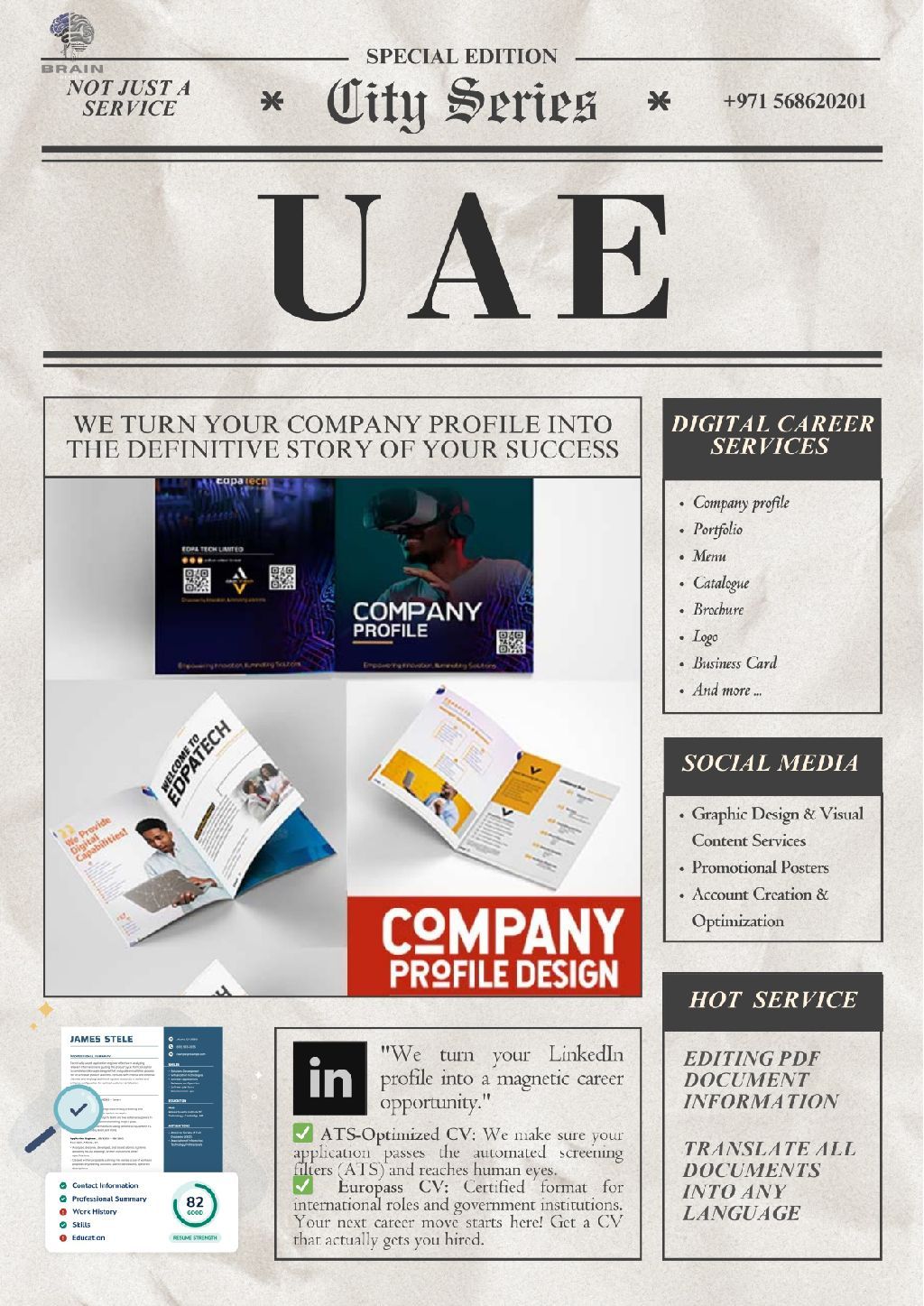 Special We offer a wide range of professional services including Portfolio creation, social media Flyers design, Company Profile development, PDF Editing, Resume writing, Cover Letter composition, Short Video production, and many more Visit for more details and inquiries