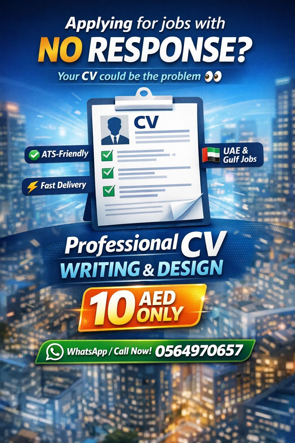 Applying for jobs with no response Your CV might be the problem Professional CV Writing & Design Arabic & English ATS - friendly Modern layout & strong content UAE & Gulf job market ready Only AED10 Fast delivery Suitable for all job fields Contact now (WhatsApp/ Calls)