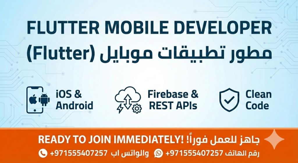 مطور تطبيقات موبايل (Flutter) متواجد في الامارات وجاهز للمباشرة الفورية. اصمم وابرمج تطبيقات (iOS & Android) بأداء سريع وكود نظيف (Clean Architecture) تطبيقات متاجر، حجوزات، ومطاعم. ربط مع Firebase وREST APIs وبوابات الدفع. ميزة العمل بدون انترنت (Offline - first) رفع التطبيقات على المتاجر. ابحث عن فرص بدوام كامل أو تعاقد