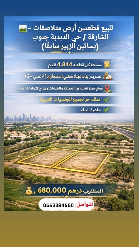 للبيع قطعتين أرض متلاصقات - الشارقة / حي الدبدبة جنوب (بساتين الزبير سابقا) مساحة كل قطعة 4844 قدم تصريح بناء فيلا سكني استثماري (أرضي + 2) موقع مميز قريب من الحديقة والخدمات وشارع الامارات العابر تملك حر لجميع الجنسيات العربية جاهزة للبناء المطلوب 680000 درهم للقطعة