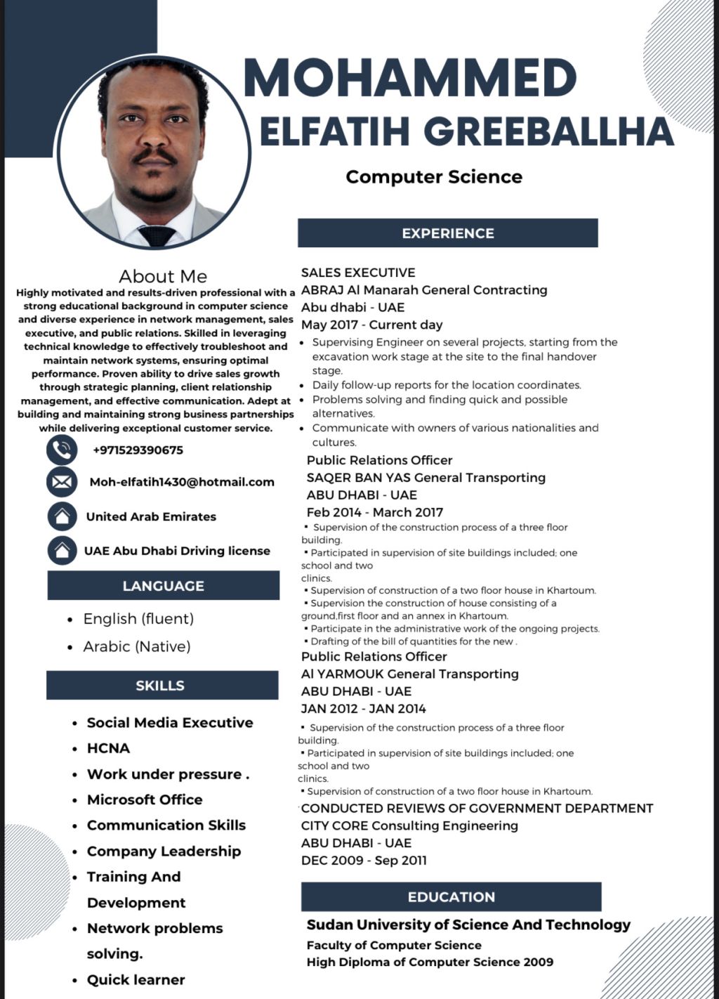 Over 10 years of experience within the UAE. Skilled in dealing with all government departments, processing official transactions, and preparing daily reports. Holder of a valid UAE driving license. Fluent in English and fully equipped to start work immediately - Sudanese and holding a vaild employee visa