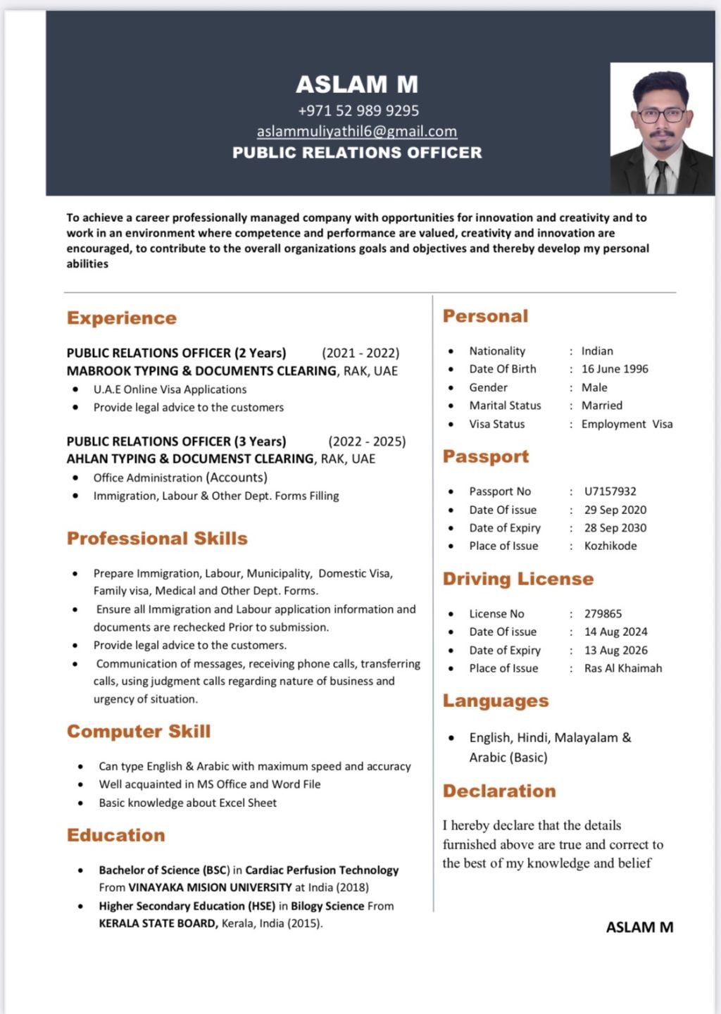 I am aslam from Kerala, Indian. Dedicated and experienced Public Relations Officer (PRO) with strong knowledge of UAE government procedures, visa processing, and documentation work. Seeking a challenging position where I can use my skills in handling official transactions, maintaining compliance, and building strong relations with government departments to support company operations effectively