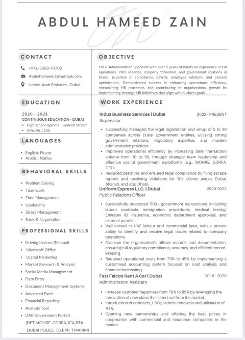 يسعدني أن أتواصل معكم للتعريف بخدماتنا الشاملة في مجال متابعة وانجاز المعاملات الحكومية ودعم الأعمال في دولة الامارات العربية المتحدة نحرص على تبسيط الاجراءات الرسمية وتقديم خدمات سريعة، دقيقة، وبتكلفة تنافسية للشركات والأفراد. وتشمل خدماتنا متابعة جميع المعاملات الحكومية والبلدية ايداع الرواتب الشهرية من خلال نظام حماية الأجور (WPS)