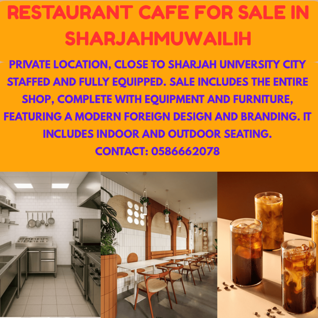 Fully operational restaurant & lounge café for sale in Sharjah - Muwailih, opposite Al Fan Al Emirati, next to Noon Minutes. The location is prime with strong daily guest traffic. The business includes a fully equipped kitchen, trained staff, and a Filipino manager. We offer both indoor and outdoor seating areas, making it ideal for all seasons. The café is active on delivery platforms