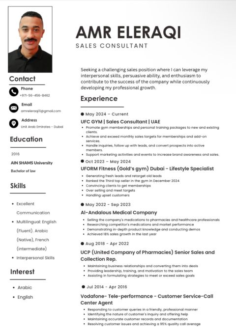 اسمي عمرو، ابحث عن عمل في مجال المبيعات في الامارات سواء في مدينة العين أو أي امارة أخرى جاهز للانتقال ومباشرة العمل فورا لدي خبرة طويله في مجال المبيعات وتحقيق التارجت بطرق ذكية وفعاله وابحث عن وظيفة جديه للانضمام فورا