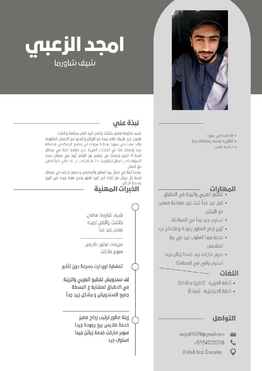 أنا شاب سوري العمر 20 سنة ابحث عن عمل لدي خبرة متوسطة بالمبيعات واعمل في مجال الشاورما شك وقص لغة انكليزية متوسطة أستطيع التعلم في أي مجال