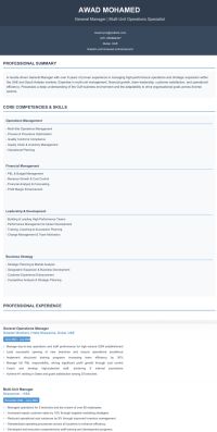 الخيار 1 باللغة العربية مدير عام قائم على تحقيق النتائج، وأتمتع بخبرة موثقة تزيد عن 9 سنوات. ابحث عن دور قيادي جديد يمكنني من خلاله توظيف خبرتي في مجالات إدارة الوحدات المتعددة، والنمو المالي، والكفاءة التشغيلية داخل أسواق الامارات العربية المتحدة والمملكة العربية السعودية
