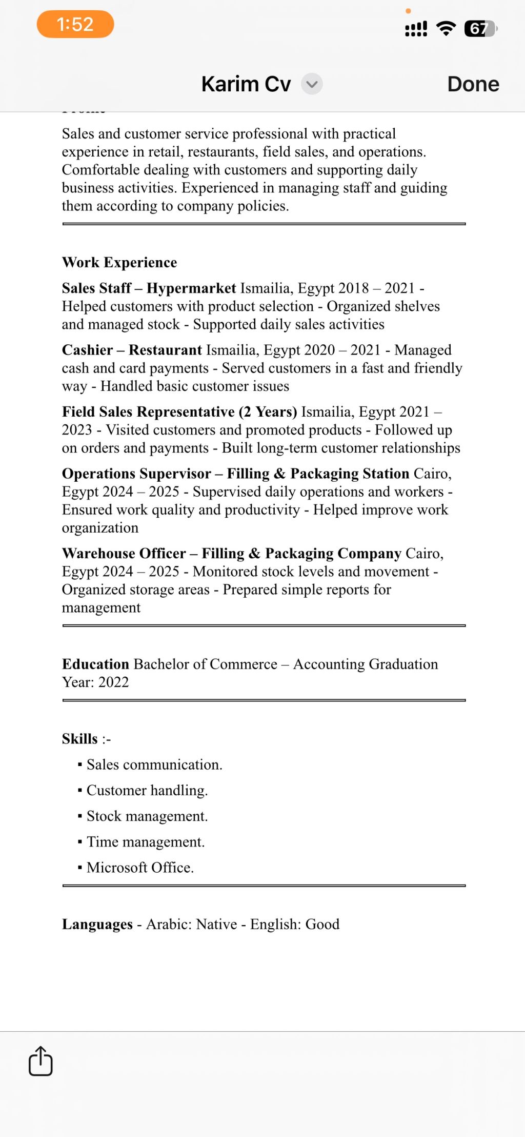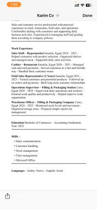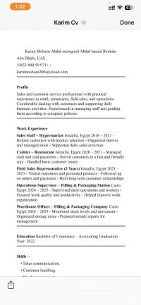 ابحث عن عمل لدي خبرة في مجالات المبيعات والسيلز وأيضا لدي خبرة بالكمبيوتر word, excel, Power Point لدي اقامة سارية سنتين، حاصل علي بكالوريوس تجارة شعبة محاسبه، وشهادة ICDL