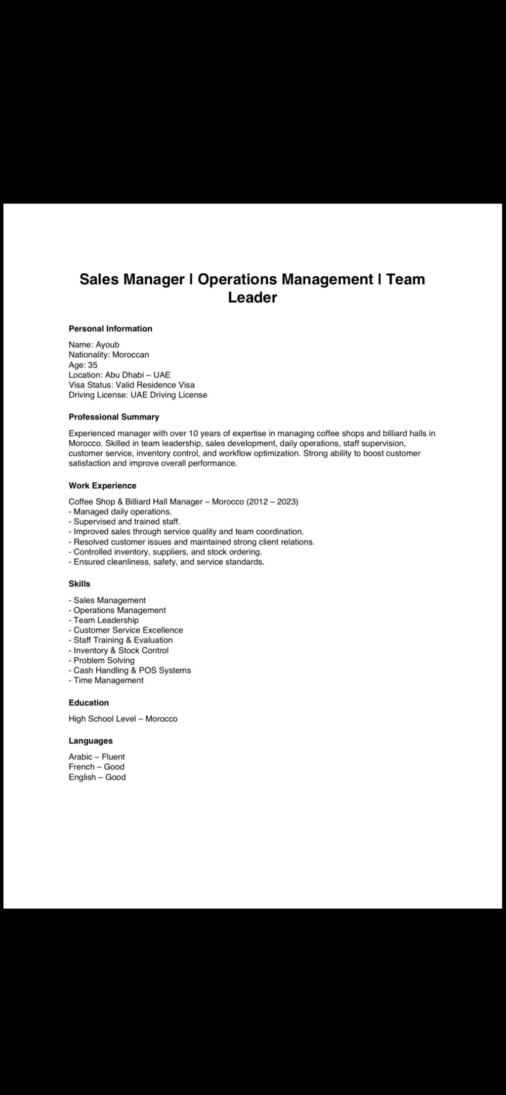 الاسم أيوب مقيم بأبو ظبي خبرة ادارة أكثر من عشر سنوات وأكثر بمجال الكوفي شوب ومحلات لبراندات عالمية NIKE / ADIDAS Dubai MALL JACK & jones مهارات عالية في الاشراف على التشغيل اليومي، ادارة طاقم متابعة، جودة الخدمة، التعامل مع العملاء، تنظيم المخزون والطلبيات وحل مشكلات مع العملاء بكفاءة وسرعة، وقادر على تطوير بيئة عمل ناجحة مع خبرة في مجال العقارات إقامة متوفرة وجاهز للعمل فورا