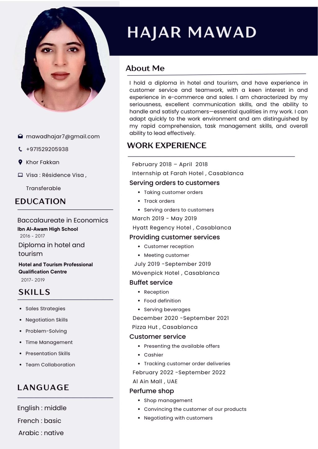أنا هاجر مغربية عمري 25 سنة مقيمة بدولة الامارات وابحث عن عمل في مجال الفندقة والسياحة أو خدمة عملاء من اجل تطوير قدراتي