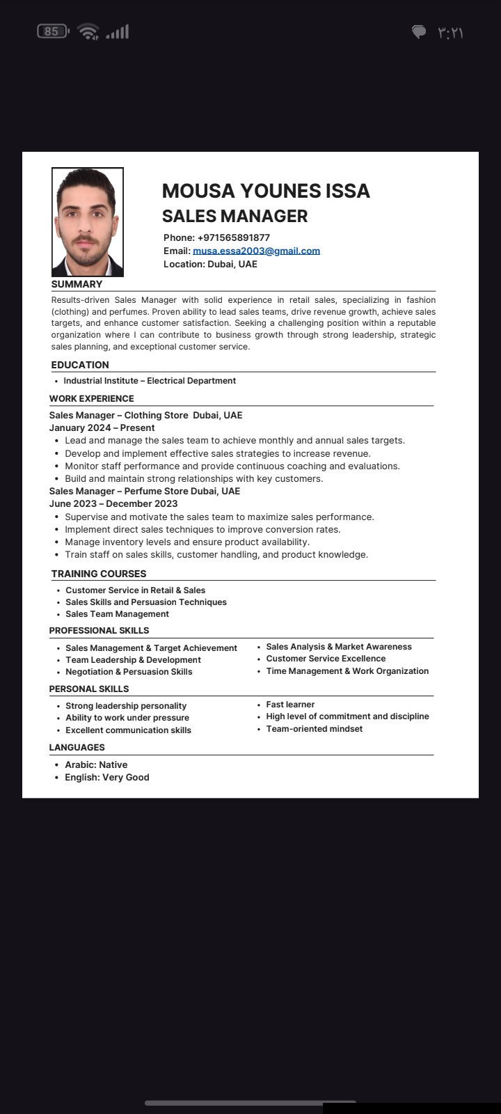 مدير مبيعات بخبرة داخل الامارات خبرة في إدارة فرق المبيعات، تحقيق التارغت، المبيعات المباشرة، وبناء علاقات مع العملاء. جاهز للعمل فورا. CV متوفر. التواصل واتساب أو اتصال