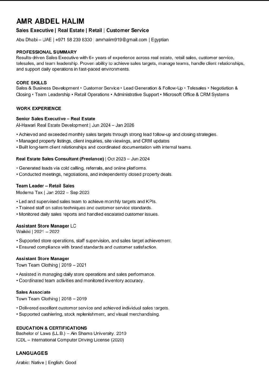 باحث عن فرصة عمل في مجال المبيعات أو الإدارة داخل الامارات. لدي خبرة أكثر من 6 سنوات في المبيعات، خدمة العملاء، وإدارة الفرق مع قدرة على تحقيق الأهداف وزيادة المبيعات وبناء علاقات قوية مع العملاء. حاصل على ليسانس حقوق وشهادة ICDL وأجيد استخدام برامج Microsoft Office. متاح للعمل فورا داخل الامارات