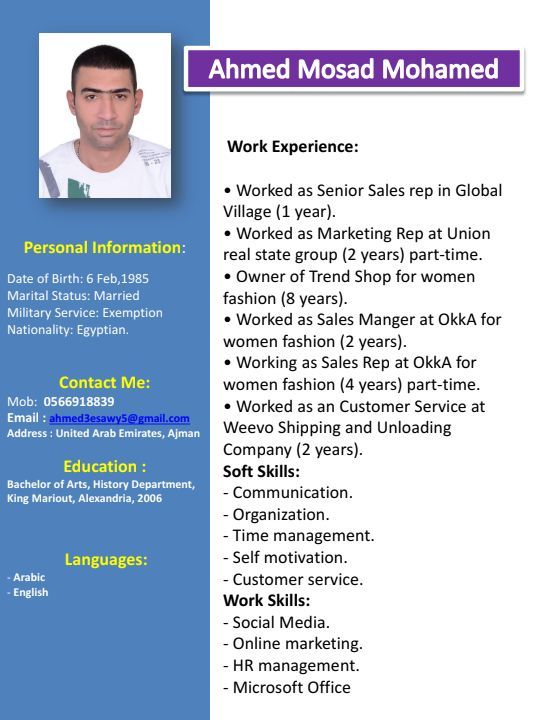 أنا الحمد لله خبرة في مجال المبيعات 3 مواسم داخل القرية العالمية وسنة في السوق الصيني عجمان و3 شهور بفسيفال عجمان وده داخل الدولة بخلاف خبرتي في مجال المبيعات في مصر