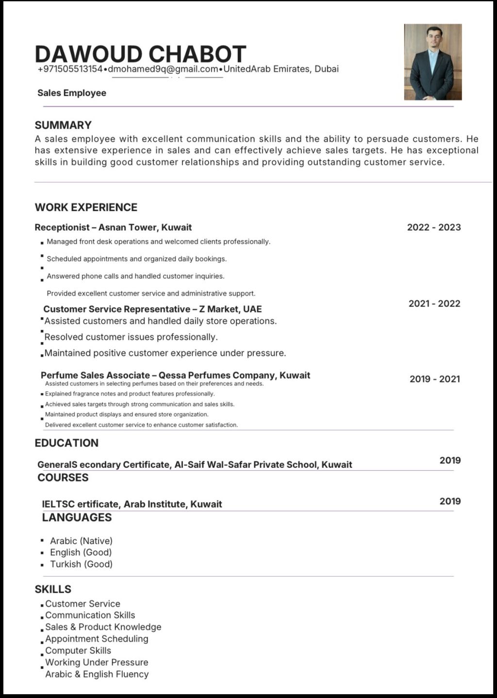 اسمي داوود مقيم في دبي ابحث عن وظيفة في المجالات الآتية مبيعات خدمة عملاء استقبال اتمنى الأنظم أم الى فريقكم