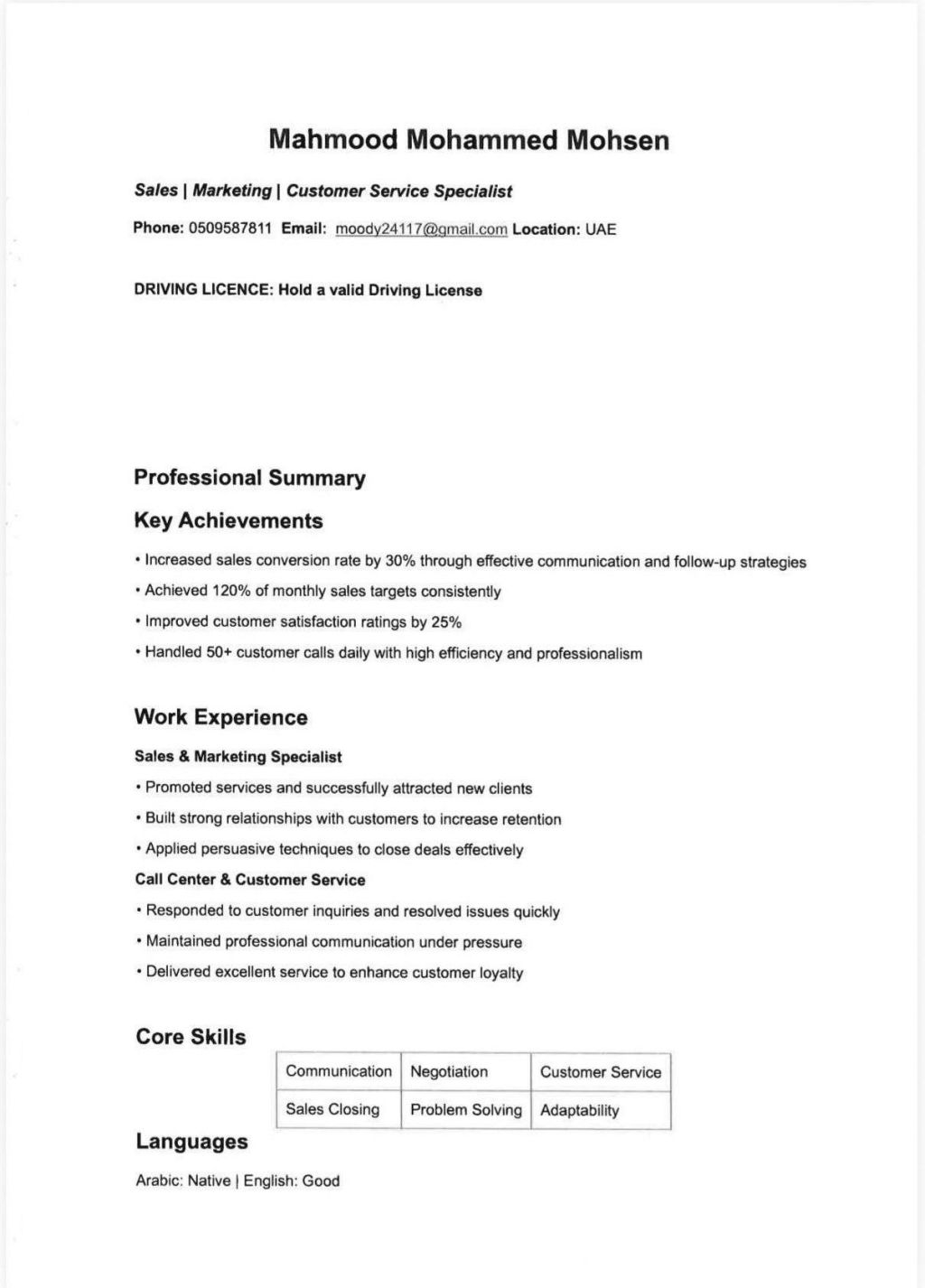 اكتسب خبرة في التسويق والمبيعات والكول سنتر ولدي خبرة في خدمة العملاء وحسن التعامل مع العملاء واكتساب معلومات العمل بسرعة ودقة