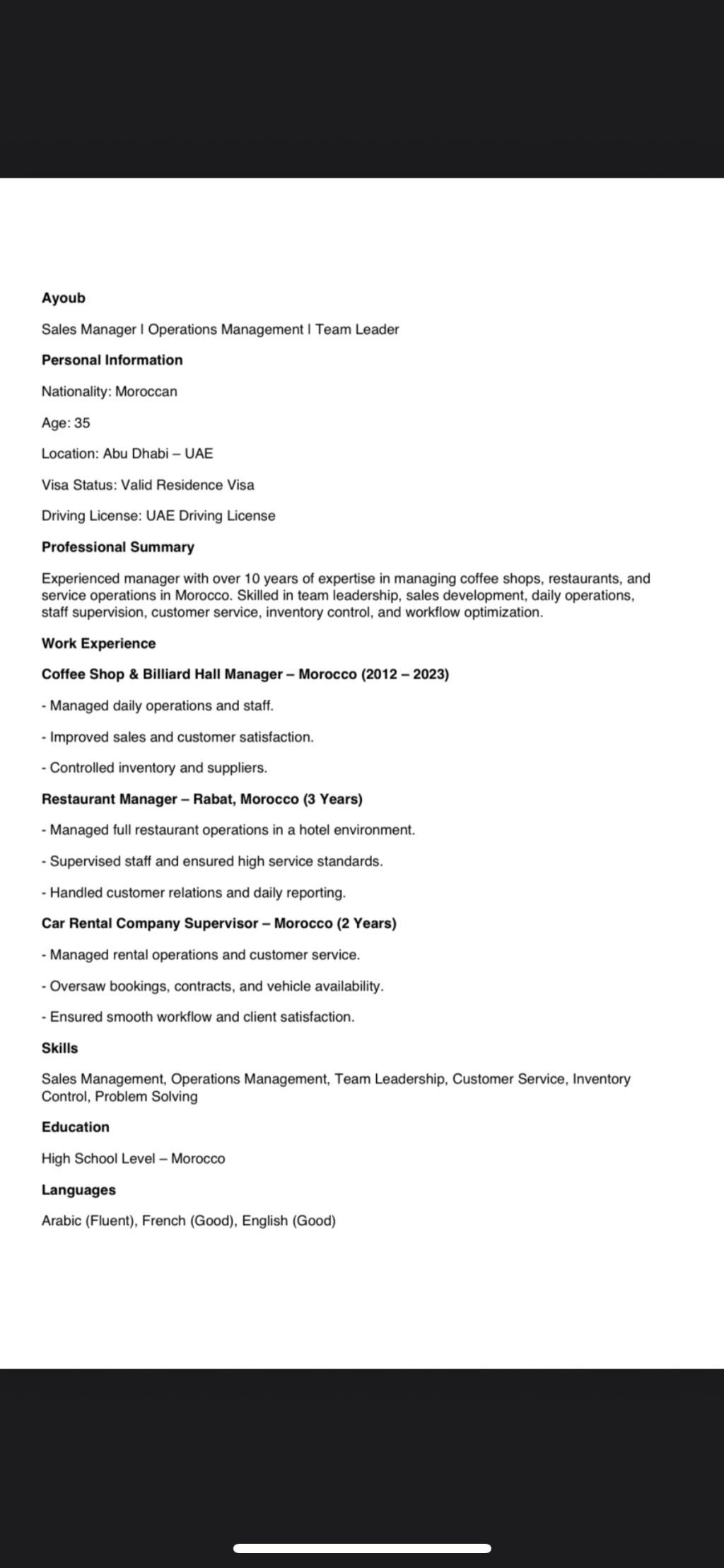 خريج تجارة مغربي الجنسية 35 سنة أكثر من 13 سنة خبرة بالمبيعات، ادارة الأعمال وخدمة عملة وادارة مشاريع محلات تجارية، مقاهي ومطاعم، وشركات لكراء السيارات الفارهة في المغرب خبرة بروكر قسم مبيعات مع أكبر مقاولين في المغرب أتكلم لغة فرنسية وانجليزية وعربية) مهارات تواصل واقناع عالية القدرة على العمل تحت الضغط، قادر على خلق بيئة عمل أحسن مع الالتزام والانضباط جاهز للعمل فورا إقامة متوفرة