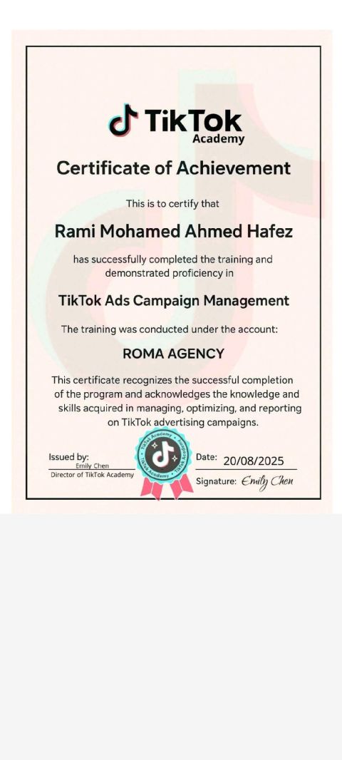 مدير تسويق سوشيال ميديا للعمل دوام أو فري لانس أجيد العمل علي كل المنصات، محترف تصوير وتعديل الفيديوهات علي برامج المونتاج محترف حملات ممولة، ولدي فريق عمل في الامارات ومصر ولدي وكالة تيكتوك بها بلوجرز ومؤثرين، خبرة كبيرة في إدارة حسابات التواصل الاجتماعي بشكل متكامل، مبدع في الأفكار التسويقية أقوم بانشاء وإدارة الحملات من البداية حتى النهاية، أستخدم AI بعملي، أتحدث الانجليزية ويوجد سابقة أعمال