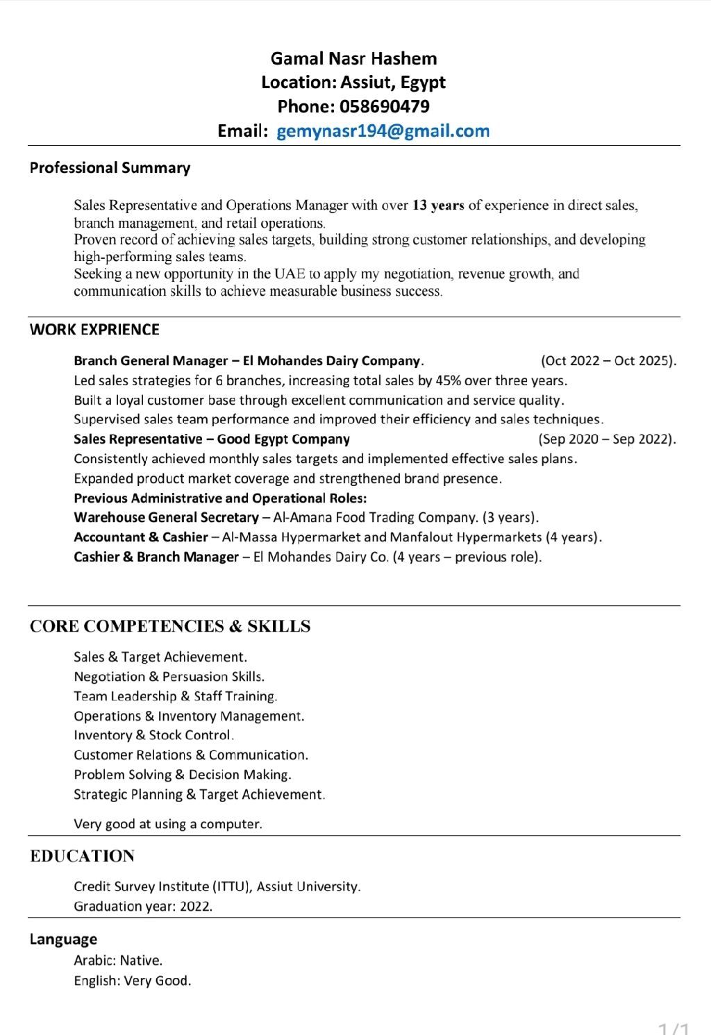 I am seeking a full time job opportunity in the United Arab Emirates. I have over 13 years of proven experience in sales and food retail, accounting, customer service, and branch and warehouse management. I have previously held several key positions, including professional cashier, warehouse keeper, branch manager, shelf stocker, sales representative, and administrative assistant