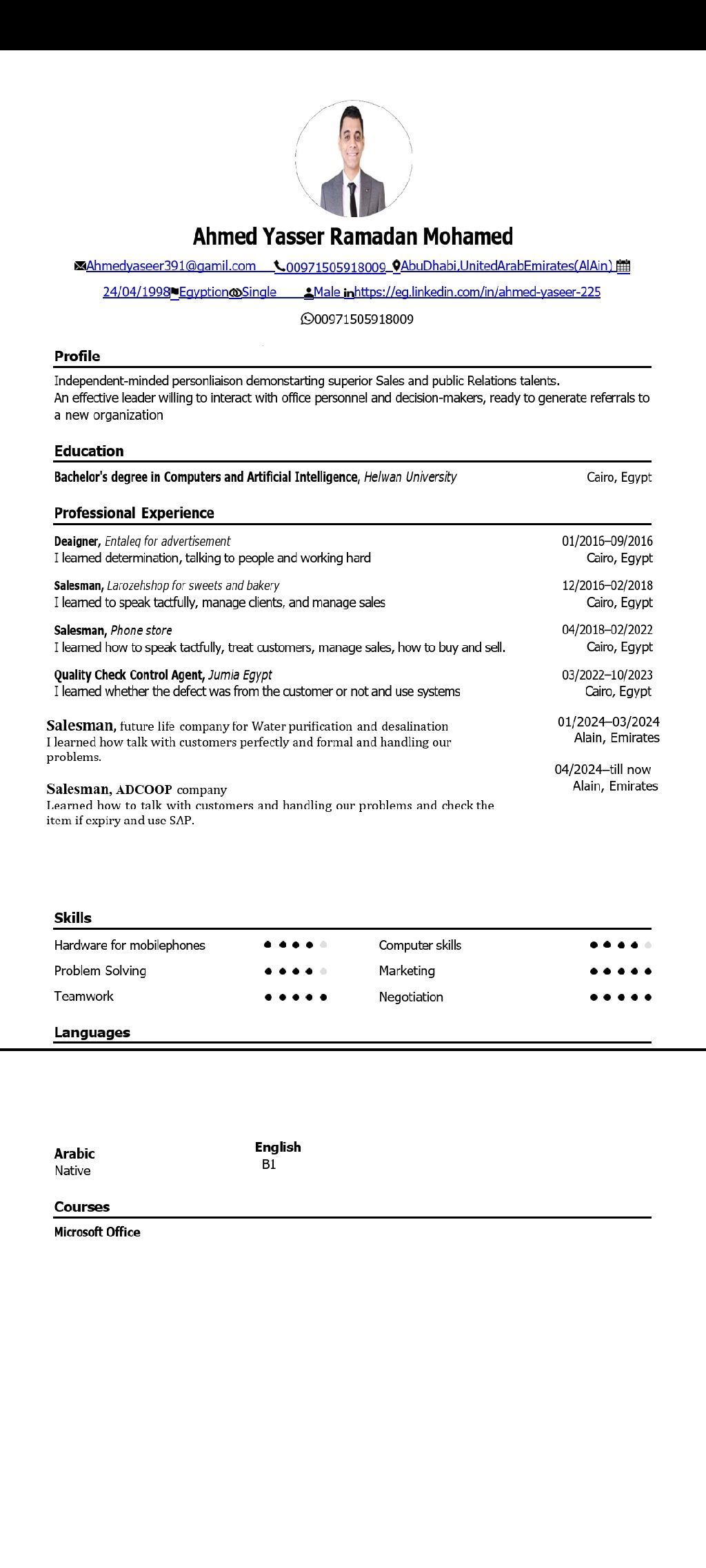 I am Egyptian seeking work in the sales field. I have two years of experience within the UAE, working at ADCOOP, and I possess five years of experience in sales. I am knowledgeable in cashier duties, receiving, stock control, and taking counter readings
