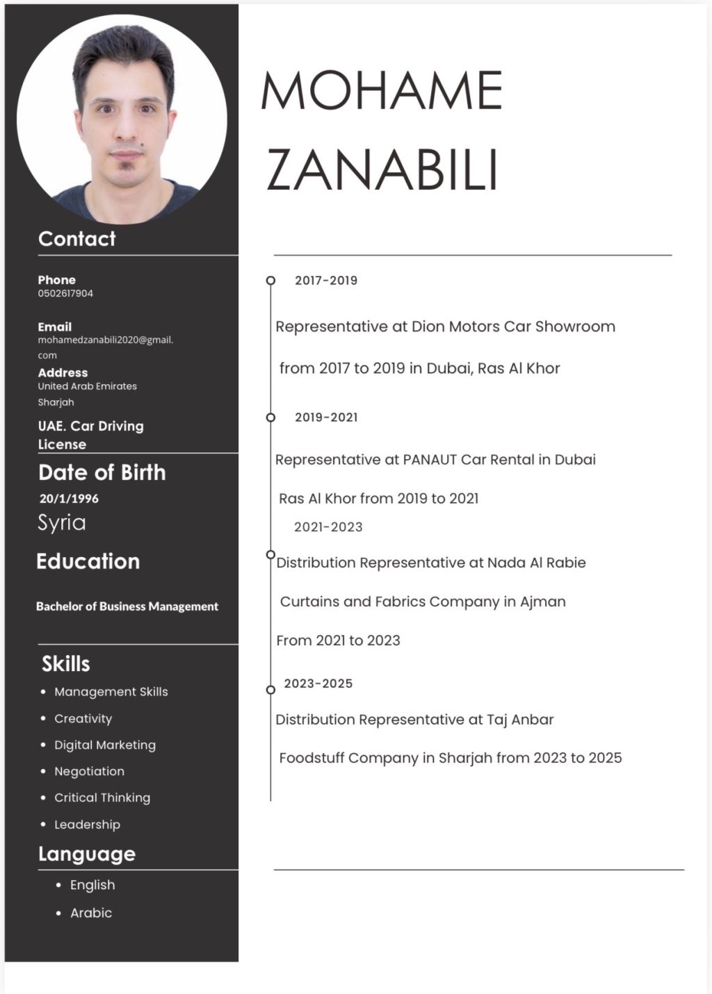 ابحث عن عمل مندوب أو توزيع عمل مندوب في ديون موتورز معرض سيارات من 2017 لي 2019 في دبي رأس الخور عمل مندوب في PANAUT تأجير السيارات في دبي رأس الخور من 2019 لي 2021 عمل مندوب توزيع في شركة ندى الربيع الستائر والأقمشة في عجمان من 2021 لي 2023 مندوب توزيع في شركة تاج عنبر المواد الغذائية في الشارقة من 2023 لي 2025