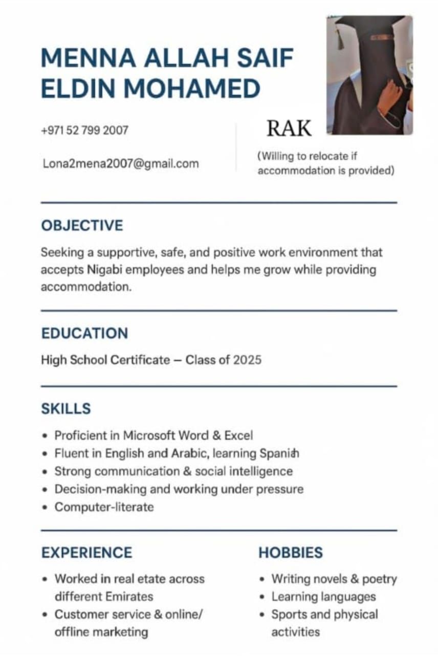 Sudanese girl with niqab im 18 years old I have experience on real estate and cars and more I am Arabic and English speaker and im learning Spanish and Germany languages and more inshallah I born in Ajman and now I am in RAK ican go another place if it have rooms