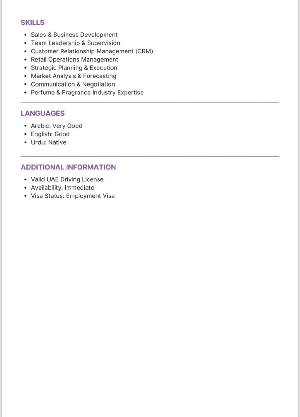 Experienced Sales Coordinator with over 18 years of proven success in the perfume and retail industry across the UAE and Saudi Arabia. Strong background in driving sales growth, leading high - performing teams, and expanding brand presence in competitive markets. Sales growth & business development Team leadership & retail operations Strong perfume industry expertise Based in UAE Driving