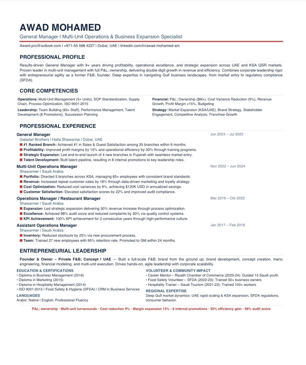 Operations Leader Transforming Goals into Results - 9 + Years of Experience in team building, sales development, cost control, and professional customer service management. Specialization Operations Management, SOP Development, and Team Leadership. Location Fujairah, UAE (Available for immediate start) Value Proposition Guaranteed operational efficiency and productivity growth