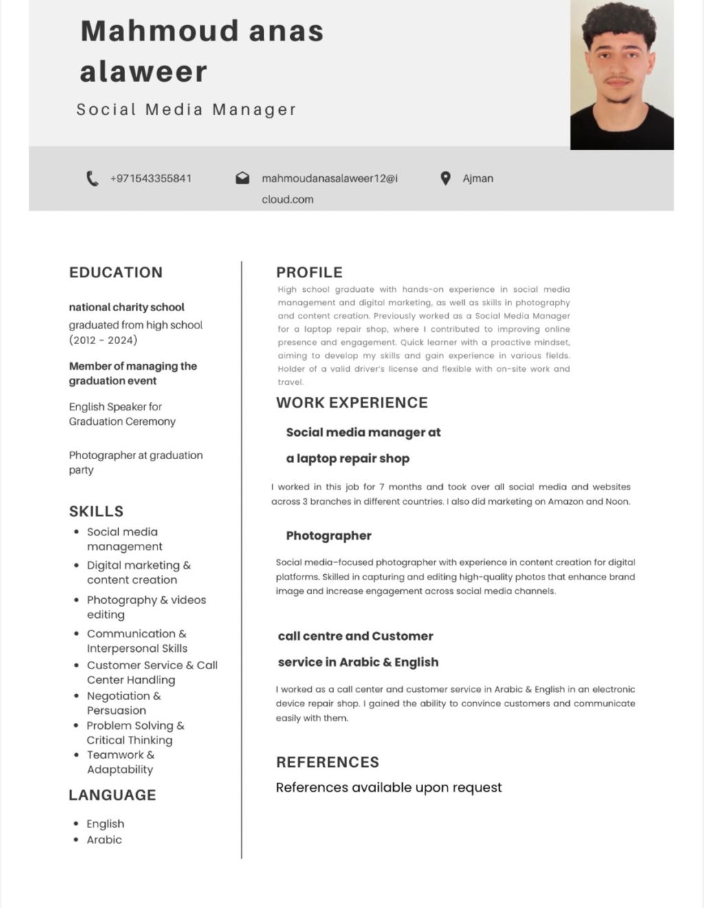 Hello, I am a 19 - year - old Syrian living in Ajman, seeking a suitable job with a good salary - Valid UAE residence visa - UAE driving license - Well - presented, good communication skills - Fast learner & ready to start immediately. Experience social media video creator - Call center & customer service. Looking for delivery. Driver. sales. Or any suitable opportunity. CV available upon request