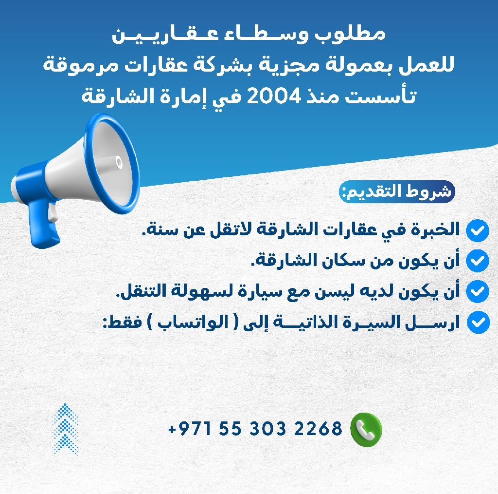 مطلوب وسطاء عقاريين للعمل بعمولة مجزية بشركة عقارات مرموقة تأسست منذ 2004 في إمارة الشارقة القصباء شروط التقديم. الخبرة في عقارات الشارقة لا تقل عن سنة. أن يكون من سكان الشارقة. أن يكون لديه ليسن مع سيارة لسهولة التنقل. يرجى ارسال أل CV