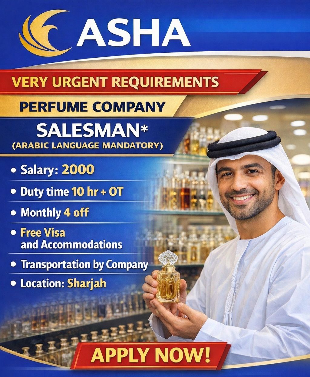 Urgent hiring for perfume sells man. salary 2000 accommodation transportation visa insurance and Kitchen facilities company will be provide. visit visa cancel visa own visa can apply overstay people also can apply. Arabic language mandatory Sharjah Alqasmia shaikh Faisal road