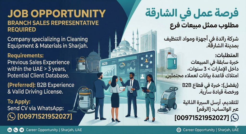 مطلوب ممثل مبيعات فرع للعمل في الامارات بمدينة الشارقة شارع المالية بشركة مختصة في اجهزة ومواد التنظيف. يشترط خبرة سابقة في المبيعات داخل دولة الامارات تتجاوز 3 سنوات، وامتلاك قاعدة بيانات لعملاء محتملين، مع تفضيل من لديهم خبرة في قطاع B2B ورخصة قيادة سارية المفعول. للتقديم يرجى إرسال السيرة الذاتية عبر