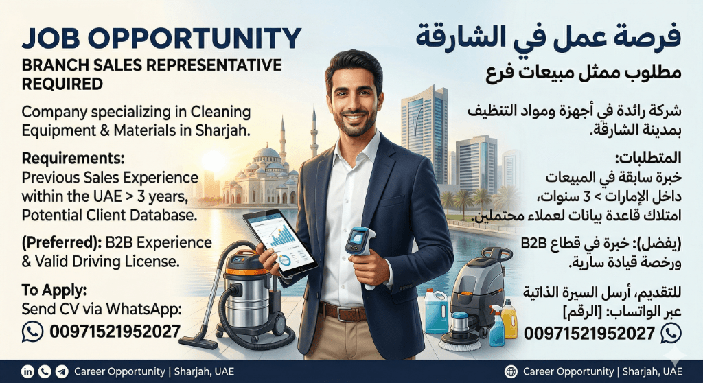 Branch Sales Representative required for a company specializing in cleaning equipment and materials in Sharjah. Candidates must have over 3 years of sales experience within the UAE and possess a potential client database. Experience in the B2B sector and a valid driving license are preferred. To apply, please send your CV via