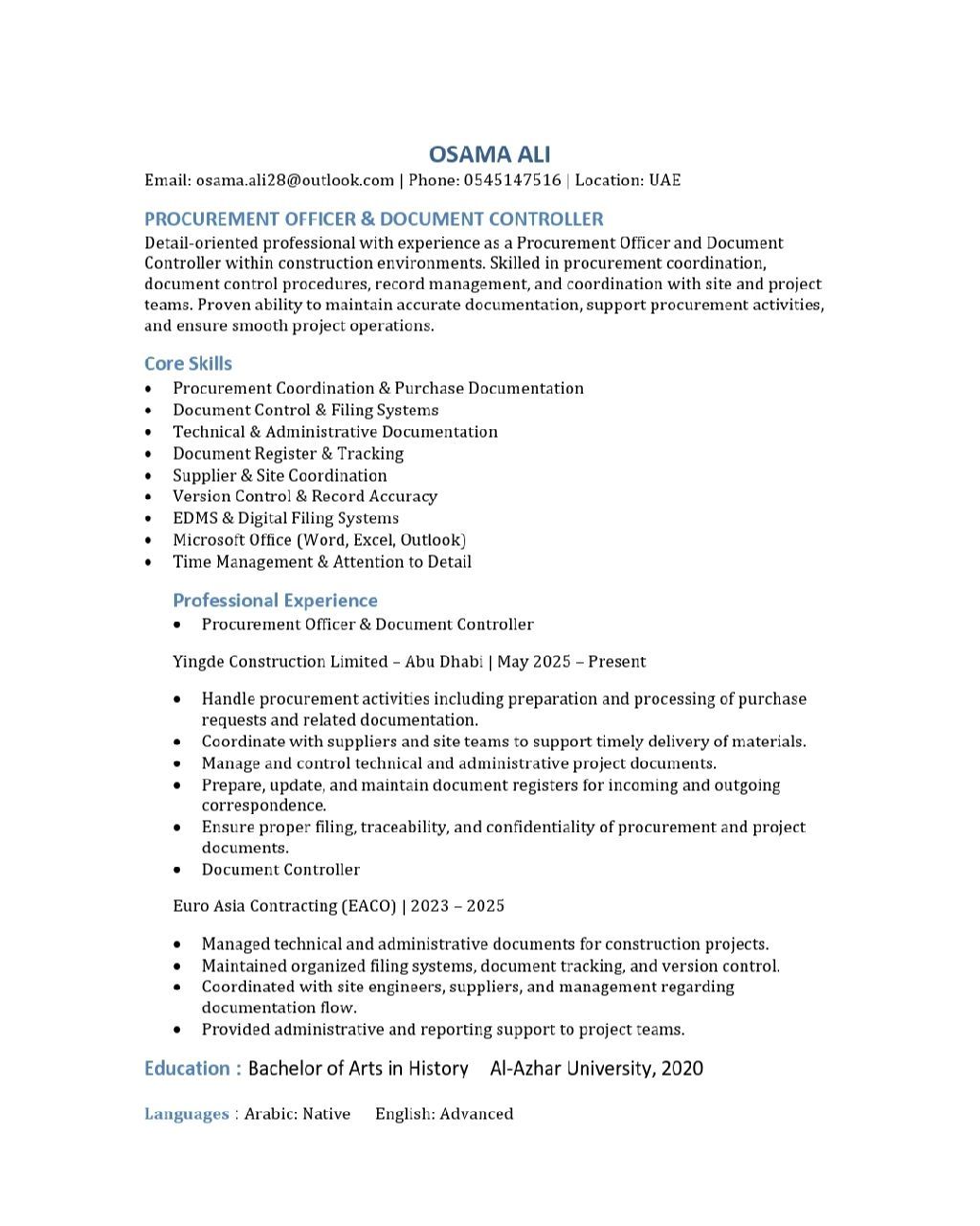 مسؤول مشتريات ومنسق مستندات (Procurement Officer & Document Controller) ذو خبرة في شركات المقاولات، متخصص في إدارة المستندات الفنية والادارية وتنسيق أعمال المشتريات بدقة وكفاءة. أتمتع بمهارات تنظيم وتواصل عالية، وأحمل رخصة قيادة اماراتية سارية، مع اقامة قابلة للإعارة