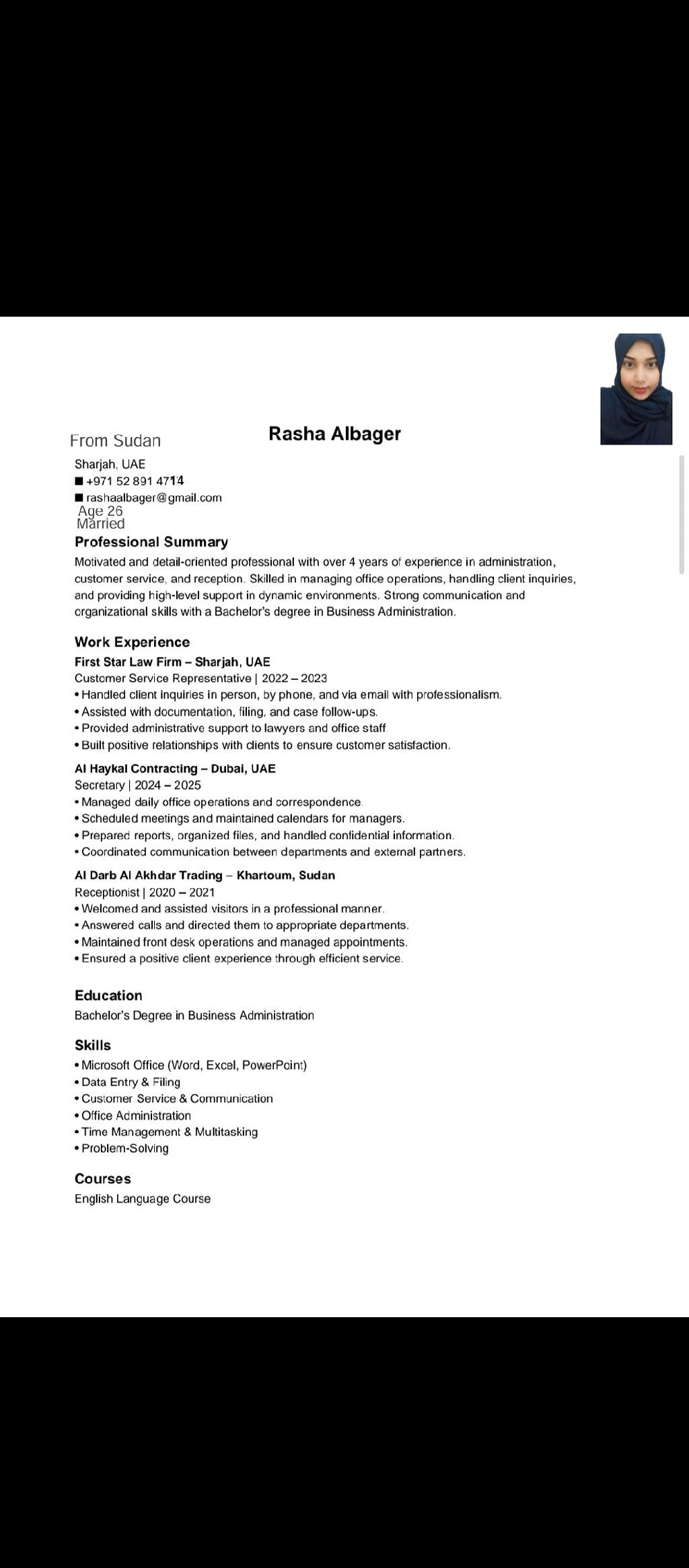 If anyone has a secretarial or receptionist position available, please contact me. I am looking for work and I am open to salary. I have experience and computer skills. I live in Sharjah