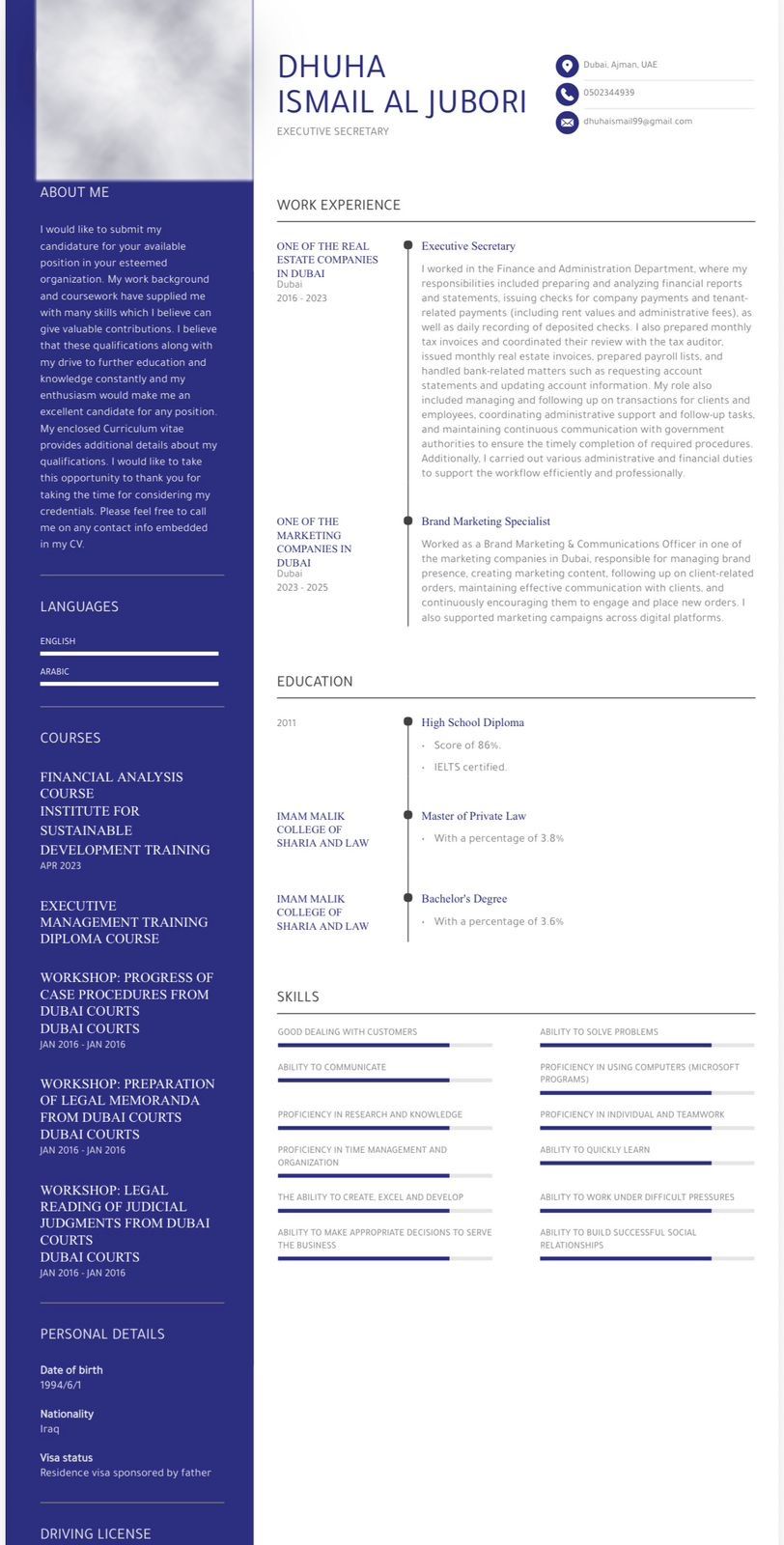 Seeking a position as an Executive Secretary with experience in the real estate sector. Holder of a Master’s degree in Law, with a valid residency visa and driving license
