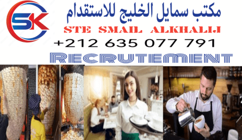 نحن شركة سمايل الخليج للتوظيف بدول الخليج نوفر لكم من المغرب عمال مطاعم وفنادق من جميع التخصصات / شيف حلواني وفينوازري / مقدمات ومقدمين طعام / كاشيرات ومحاسبات / معلمين ومعلمات باريستا وعصاير أسيوية / موظفات استقبال فنادق ومطاعم / وجميع موظفي الفنادق والمطاعم في بكفاءات عالية للطلب أو الاستفسار يرجى التواصل معنا عبر أرقامنا