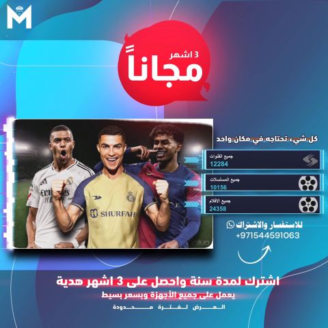 شاهد كل ما تحب على أقوى منصة ترفيهية أكثر من 12000 قناة قنوات رياضية - باقة أفلام ومسلسلات محدثة يوميا - قنوات أخبار يوجد تجربة مجانية للسيرفر لمدة 24 ساعة عرض خاص اشترك الآن سنة واحصل على 3 أشهر مجانا متاح على جميع الاجهزة التلفزيون، الموبايل، التابلت، والكمبيوتر. للاشتراك