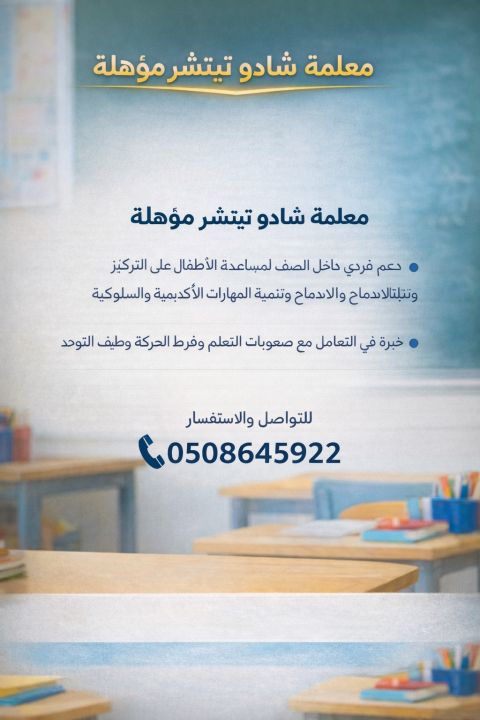 علمة شادو تيتشر مؤهلة دعم فردي داخل الصف لمساعدة الاطفال على التركيز والاندماج وتنمية المهارات الأكاديمية والسلوكية خبرة في التعامل مع صعوبات التعلم وفرط الحركة وطيف التوحد