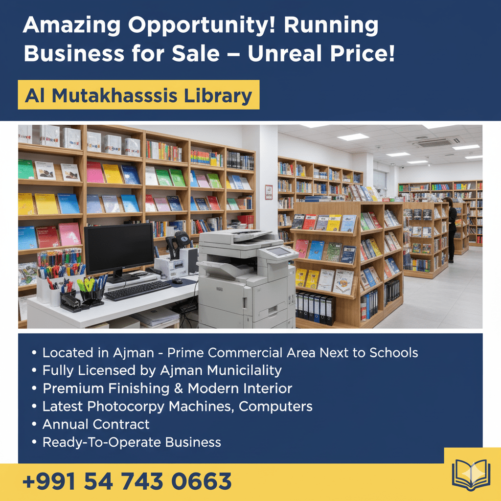 فرصة استثمارية جاهزة في عجمان هل تبحث عن مشروع جاهز وناجح من اليوم الأول مكتبة المتخصص هي فرصتك الذهبية موقع مميز في منطقة تجارية حيوية في عجمان بجوار المدارس مباشرة مكتبة قائمة وتعمل بالفعل، مجهزة بالكامل وبأفضل تشطيب لتبدأ مشروعك فورا دون أي عناء. مميزات المكتبة مرخصة رسميا من بلدية عجمان تشطيب عالي الجودة وتصميم أنيق أحدث ماكينات التصوير واجهزة الكمبيوتر تجهيزات كاملة من المستلزمات المدرسية والمكتبية