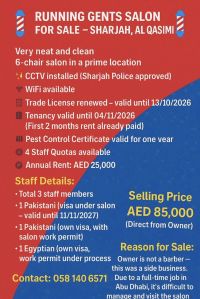 Running gents salon for sale in Sharjah Al Qasimia near Al mahattah park price AED85000