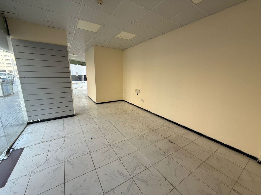 Annual Shop for rent in the Heart of Al Butina A shop available for annual rent with direct frontage on the main road. It offers a large area with a practical layout, elegant security glass facades, and central air conditioning. Highly flexible and suitable for various commercial uses. Price AED55000 per year, payable in 4 installments
