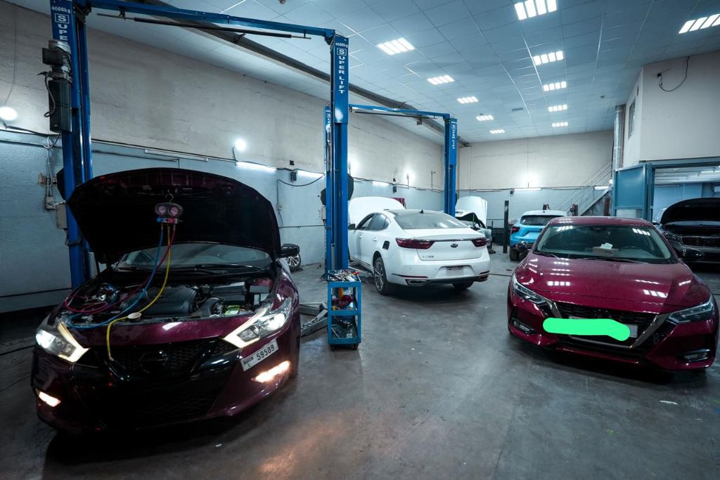 For rent in Ajman Industrial Area 4, garage of 200m with air - conditioned management room, fully AC garage, paint room, bathroom, 4 ceiling height, 2 jacks, air compressor, mechanical, bodywork and painting tools, full CCTV coverage, and WiFi - For contact (Call