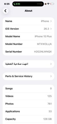 IPhone 15 plus للبيع في إمارة الشارقة المجاز 3 تلفون بطارية 95 مغير شاشة وكاميرا بس أعلى حاجة تلفون نظيف لسرعة البيع ب 1300 درهم للتواصل