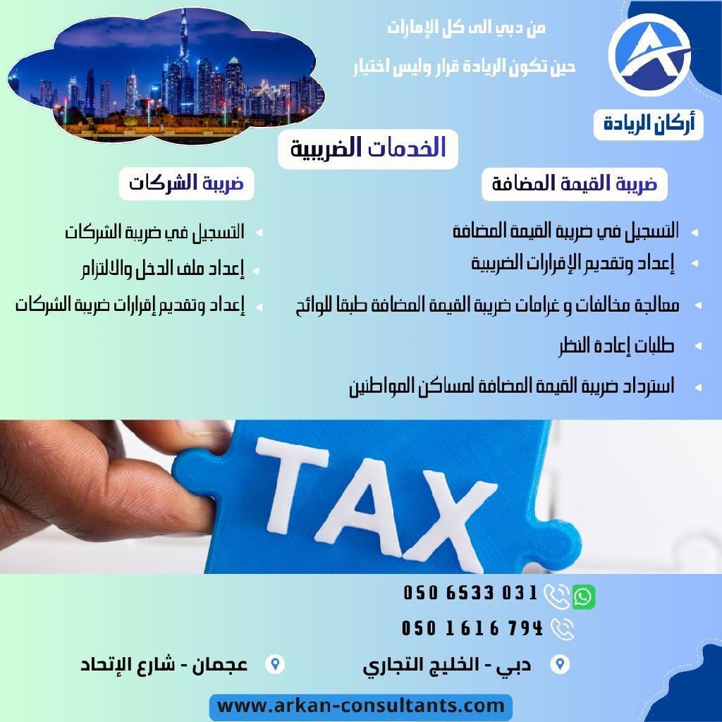 مع اركان الريادة للاستشارات الضريبية والمحاسبية ضرائبك في ايد أمينة وحساباتك تدار بكفاءة، لا تقلق من التعقيدات الضريبية وضع مسؤولية حسابات أعمالك في ايد خبراؤنا فريقنا يتولى كل شيء بدقة واحترافية عالية. من تسجيل الضريبة، تقديم الاقرارات، مسك الحسابات، وحتى دراسات الجدوى كل خدماتك تحت سقف واحد مع خبراء معتمدون بخبرة تزيد عن 15 عام داخل الامارات
