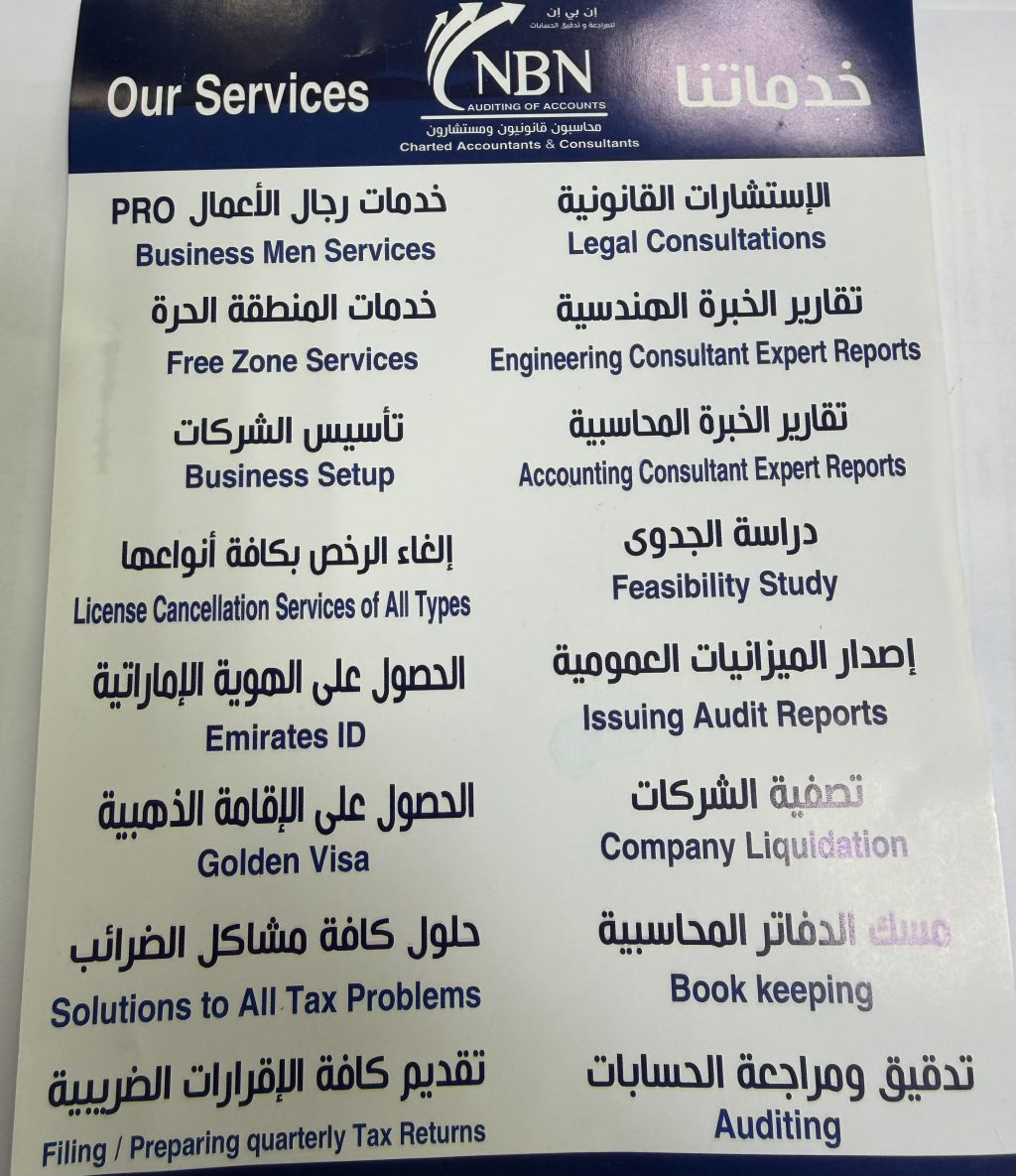 شركة NBN للاستشارات القانونية والحسابات تقارير الخبرة المحاسبية دراسة الجدوى حلول كافة مشاكل الضرائب تقديم كافة الاقرارات الضريبيه نساعد الشركات علي تجنب الغرامات والامتثال للقوانين وتوفير المال لدينا محاسب مسؤول كما نقوم بأعمال المحاسبه اليوميه وتسجيل الايرادات والمصروفات ندير سجلاتكم المحاسبية اليوميه والتدقيق المالي ومراجعة الامتثال